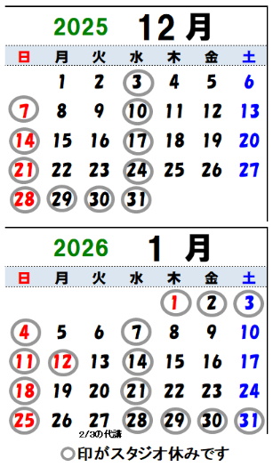 ※1月は1週間の冬休みがありますのでご了承ください。その分は他の曜日にお越しください。(月謝制) ※1月よりBクラスの発表会出演者は30分延長レッスンになります。 ※レッスン中のマスクの着用は自由です。水分補給に留意してください。