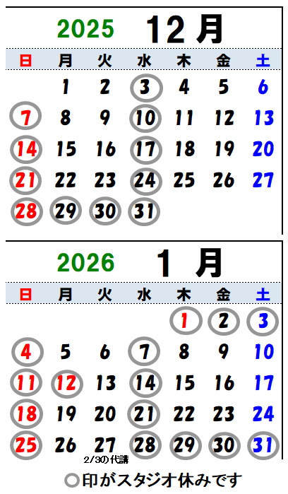※1月は一週間の冬休みがありますのでご了承ください。その分は他の曜日にお越しください。