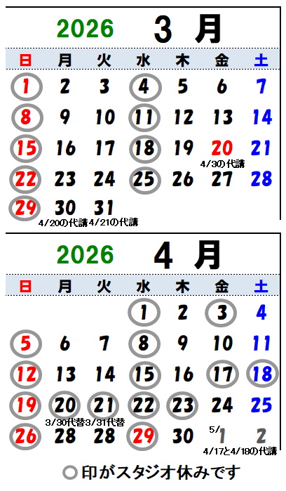 ※四月は発表会のために変則的なスケジュールです。どうかご了承ください。